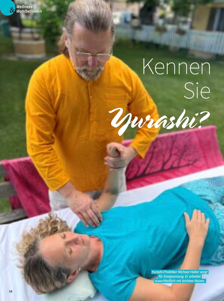 "Als Yurashi-Therapeut berühre und bewege ich behutsam einzelne Teile deines bekleideten Körpers. Du kannst die Behandlung genießen, weil sie völlig schmerz- und belastungsfrei abläuft. Die sich verselbständigten und anhaltenden Verteidigungsinstinkte werden durch den positiven Einfluss auf das Nervensystem ausgeschaltet, Schmerzen aufgelöst, die Versorgung der inneren Organe, ja, aller Zellen verbessert sich genauso wie der Lymphfluss. Der Körper kann seine Selbstheilungskräfte wieder entfalten."